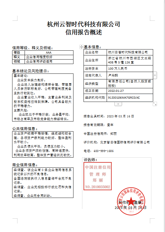 信用评价机构:北京智云信国际信用评价有限公司 |