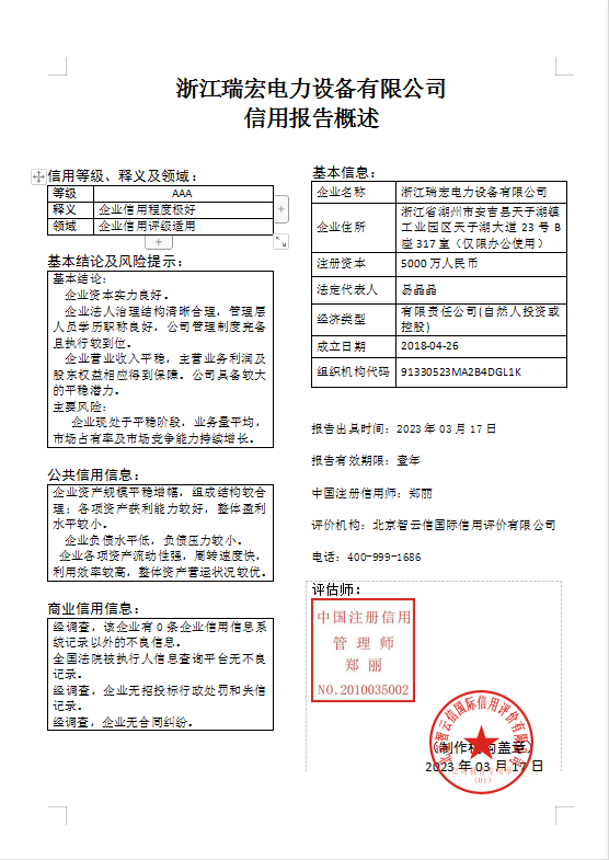 综合评价: 一、专业第三方信用评价机构根据国务院《社会信用体系建设规划纲要(2014-2020年)》(国发2014第21号)建设要求,依据中华人民共和国信用行业标准对该单位的相关信用信息进行综合评价,并依法出具信用证书和建立信用档案公示,接受社会监督。信用分析师认为,同等条件下,该单位的可信度、信任度和社会责任度相对很高。 二、本信用证书和信用档案是中立和中性的,它证明该单位已纳入社会信用体系的监督之中,任何组织和个人可以遵循诚信原则方便地对该单位进行评价(表杨、批评、建议);任何组织和个人可以方便地查询该单位良好信息、不良信息和整改信息。该单位也可以通过诚信经营不断增加信用分值和增加良好信用信息记录,积累信用无形资产。三、根据该单位提供的相关资料,依据中华人民共和国信用行业标准Q/ZYX 002-2019《企业信用评价体系标准》,专业第三方信用评价机构或信用认证机构对其信用等级评定为:AAA 级。四、提醒该信用档案、信用证书及信用铭牌的使用者:请密切关注合作和交易对方的各项信用指标或最新信用报告或年检记录信息,整体把握信用风险,以保障合作和交易安全;请随时关注合作和交易对方的信用动态变化或跟踪评价报告,及时把握信用趋势,以掌控商业风险。信用是企业的生命线;信用档案是企业信用评价结果的动态记录,具有法律效力的信用证书是企业、商家及网站的第二“信用身份证”,信用档案和信用证书是企业、商家及网站获得客户信任、促成合作和交易的基础,是大众消费、合作和交易决策的重要依据,是我国社会信用体系建设的公平保障体系。 |